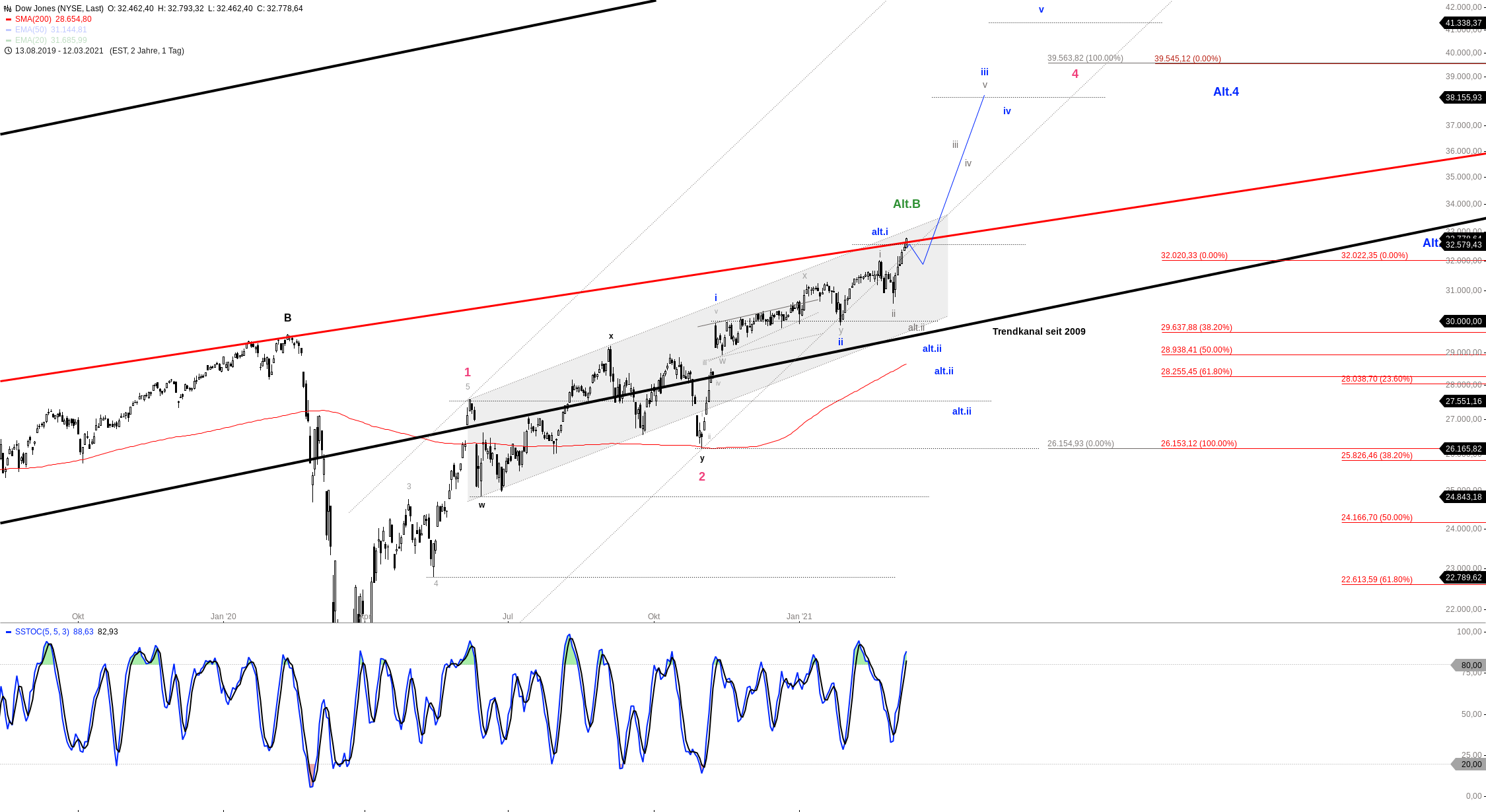 Auf dem Tageschart Chart3 (siehe oben) erkennt man, dass der Dow Jones die Bewegung 1-2 / i-ii i-ii abgearbeitet hat. Er ist nun im Ausbau der Welle iii, die aus den Unterwellen i-ii-iii-iv-v besteht, die den Dow Jones direkt durch diese Linie hindurchführen sollten.