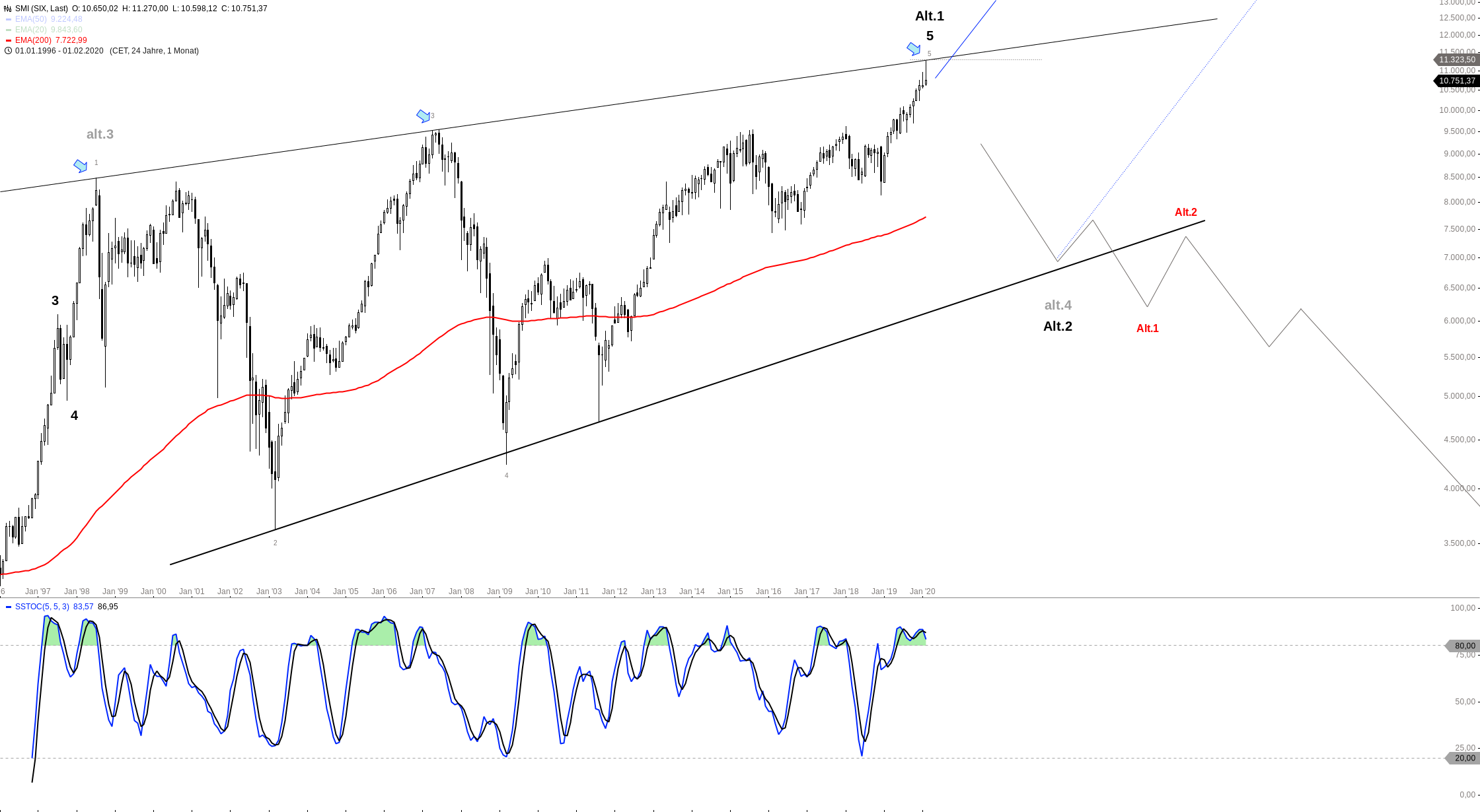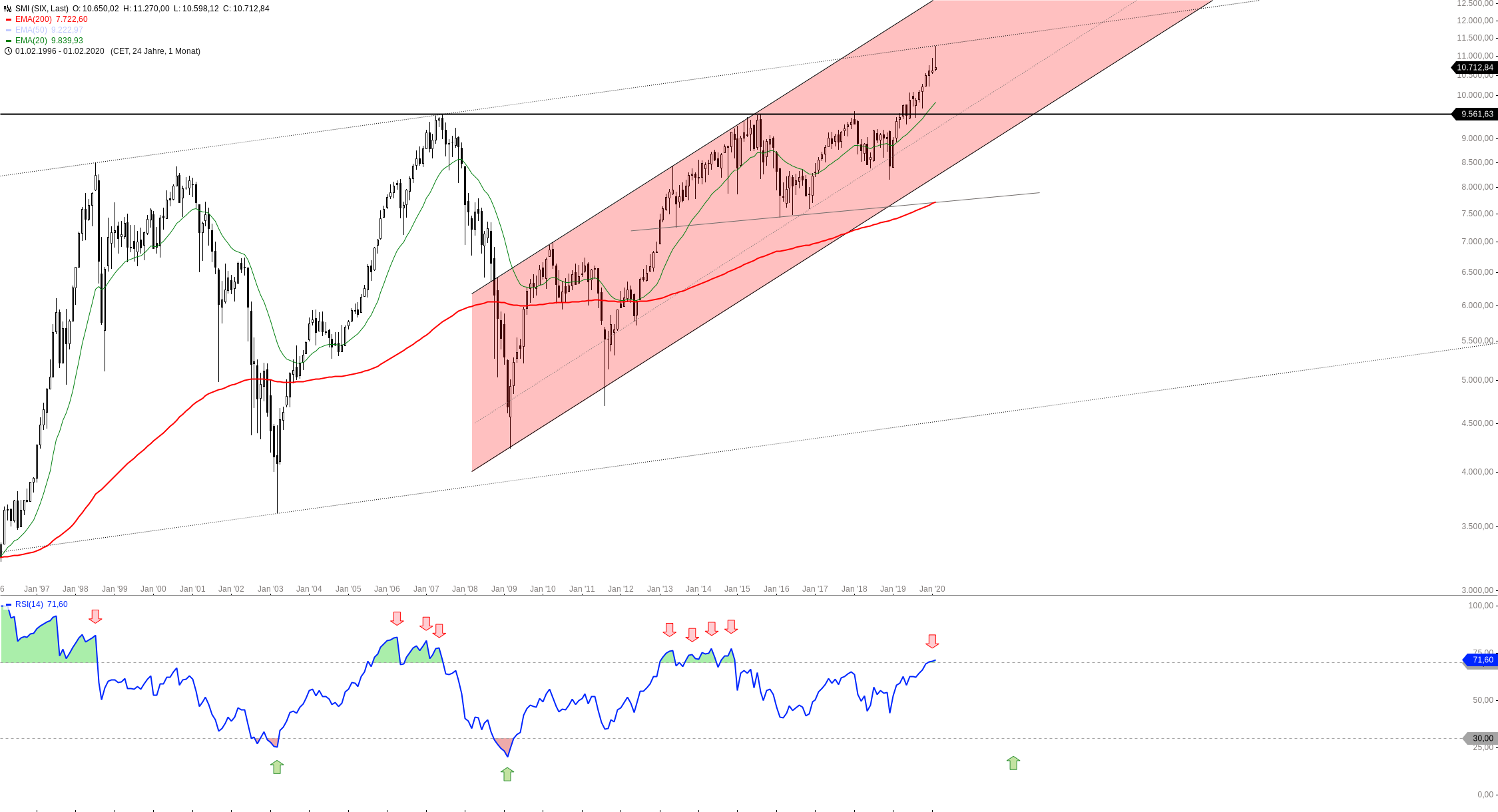 Monatschart SMI Index 1996 – 2020, eine Kerze entspricht einem Monat – Chart by Guidants.