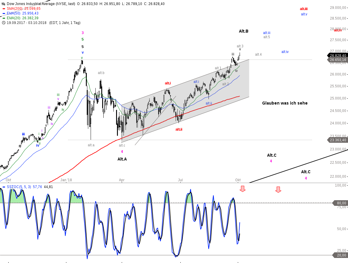 Dritte Möglichkeit: die Pinke 3 ist schon das Ende der grossen Welle 5 – der übergeordneten grossen 1-2 Bewegung – und wir befinden uns schon in der langfristigen Abwärtsbewegung. Dann wäre die Alt.1 schon ausgebildet und wir sind jetzt in der Welle Alt. 2, worauf eine starke Wellenbewegung Alt. 3 nach unten folgen würde. (Diese Möglichkeit ist seit dem neuen Hoch in Dow Jones, nicht mehr haltbar. Wellen-Zähl-Möglichkeiten bilden sich alternativ zu den ständig neu entstehenden und sich ständig neu veränderten Wellen – und dem Dazugehörigen Wellenbild – täglich von neuem. Darum erkennt man auch sehr schnell, wenn eine Zählung stimmt und die richtige „Sicht“ bestätigt. )