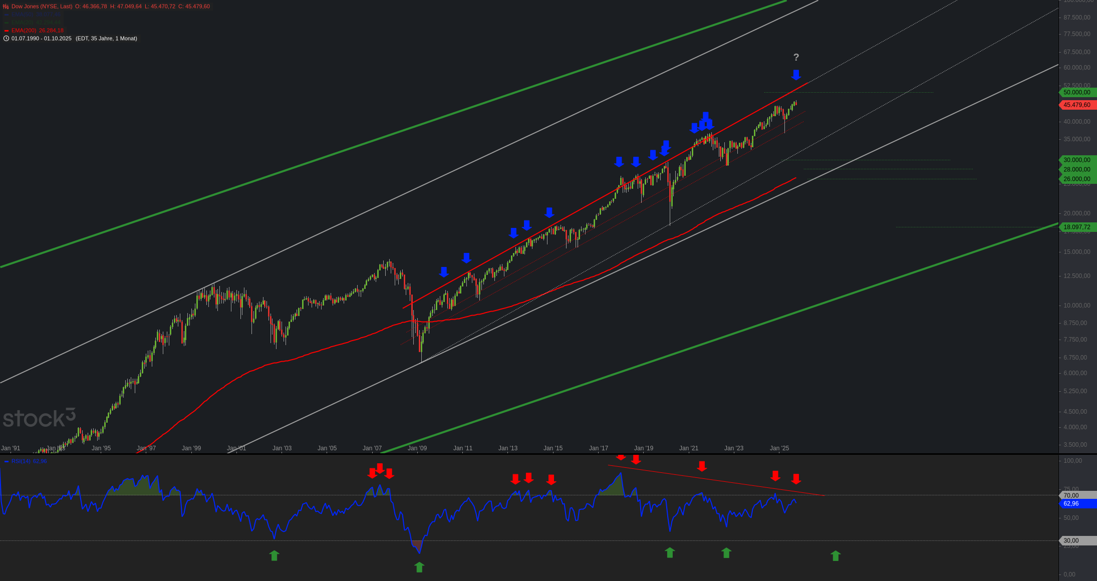Monatschart Dow Jones Index 1990 – 2025, eine Kerze entspricht einem Monat – Chart Stock3.
