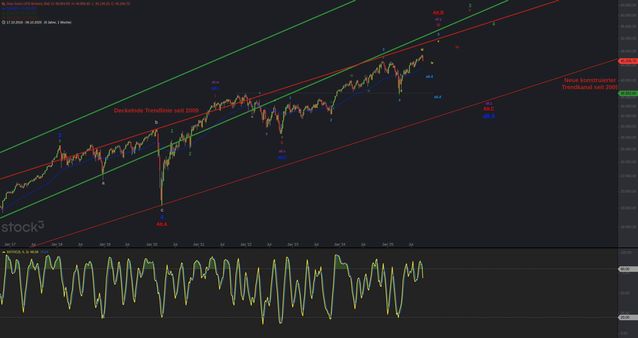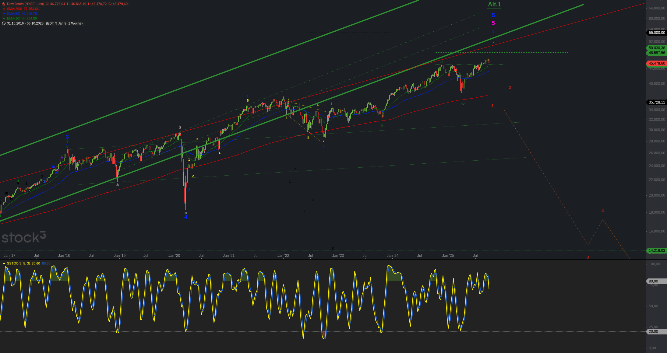Wochenchart Dow Jones Index 2017 – 2025, eine Kerze entspricht einer Woche – Chart Stock3.