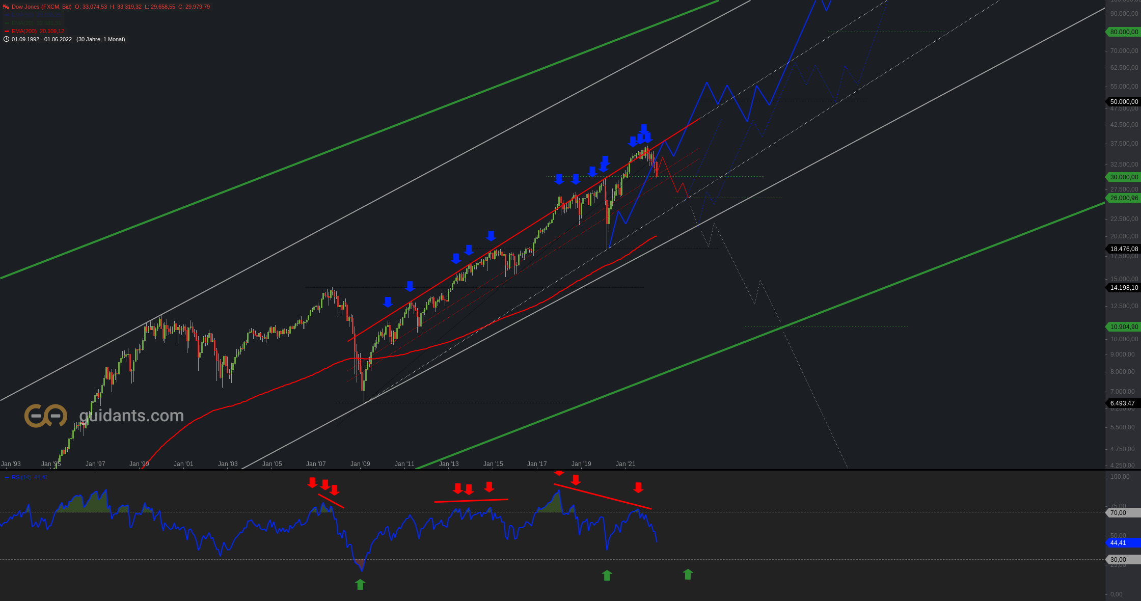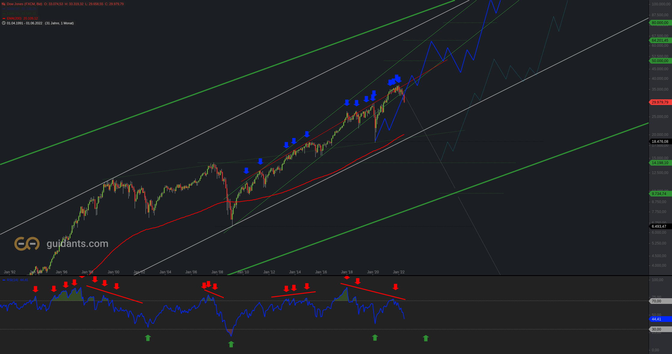 Monatschart Dow Jones Index 1992 – 2022, eine Kerze entspricht einem Monat – Chart by Guidants.