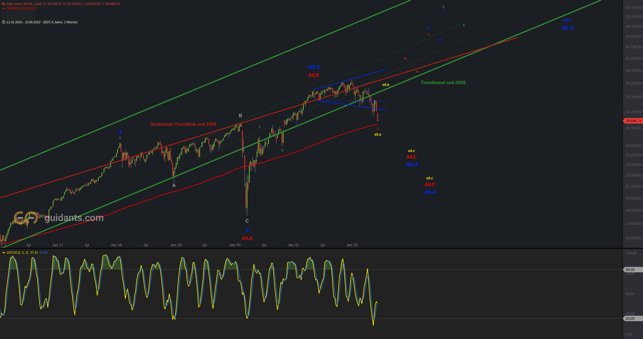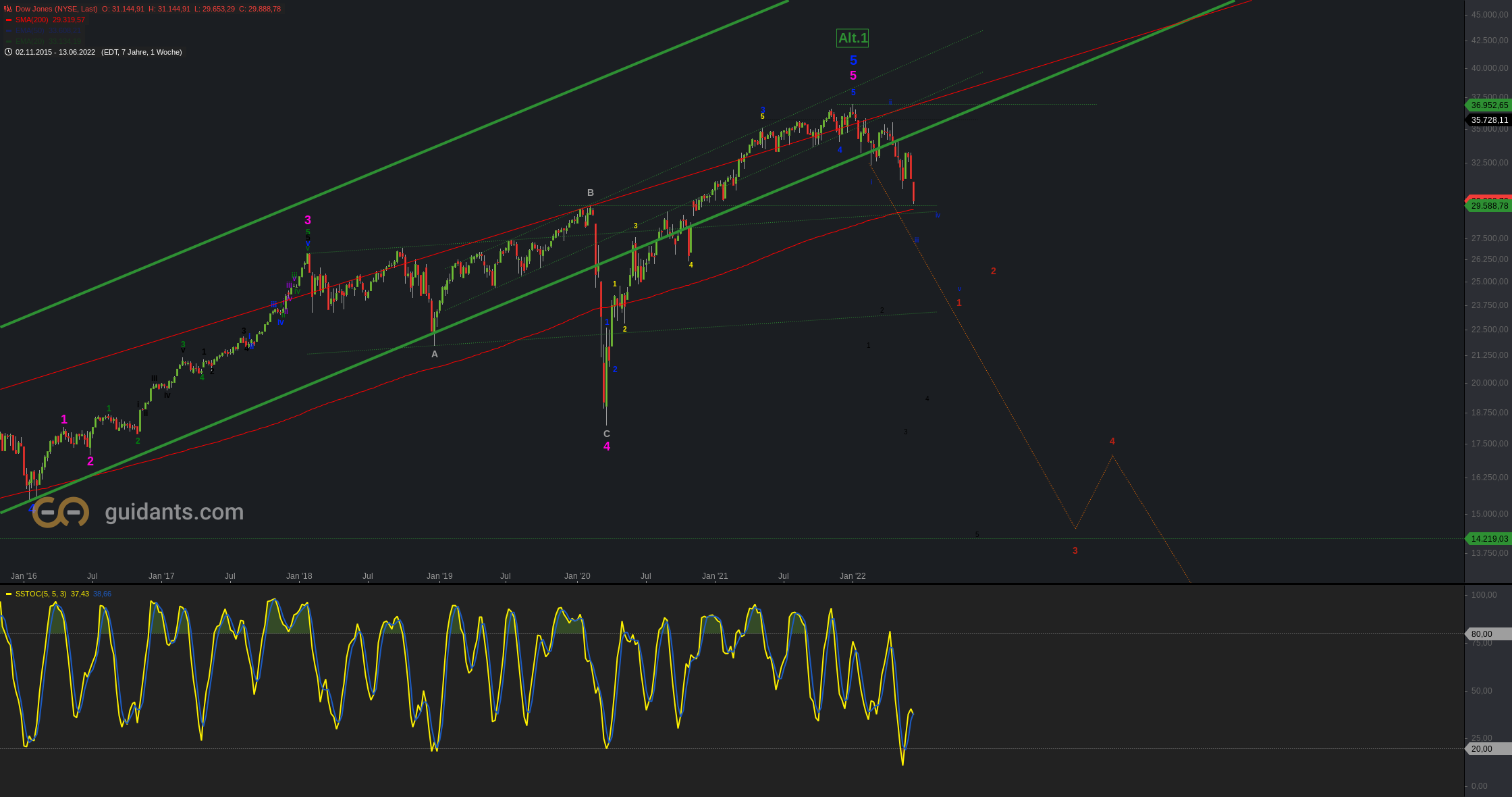 Wochenchart Dow Jones Index 2015 – 2022, eine Kerze entspricht einer Woche – Chart by Guidants.