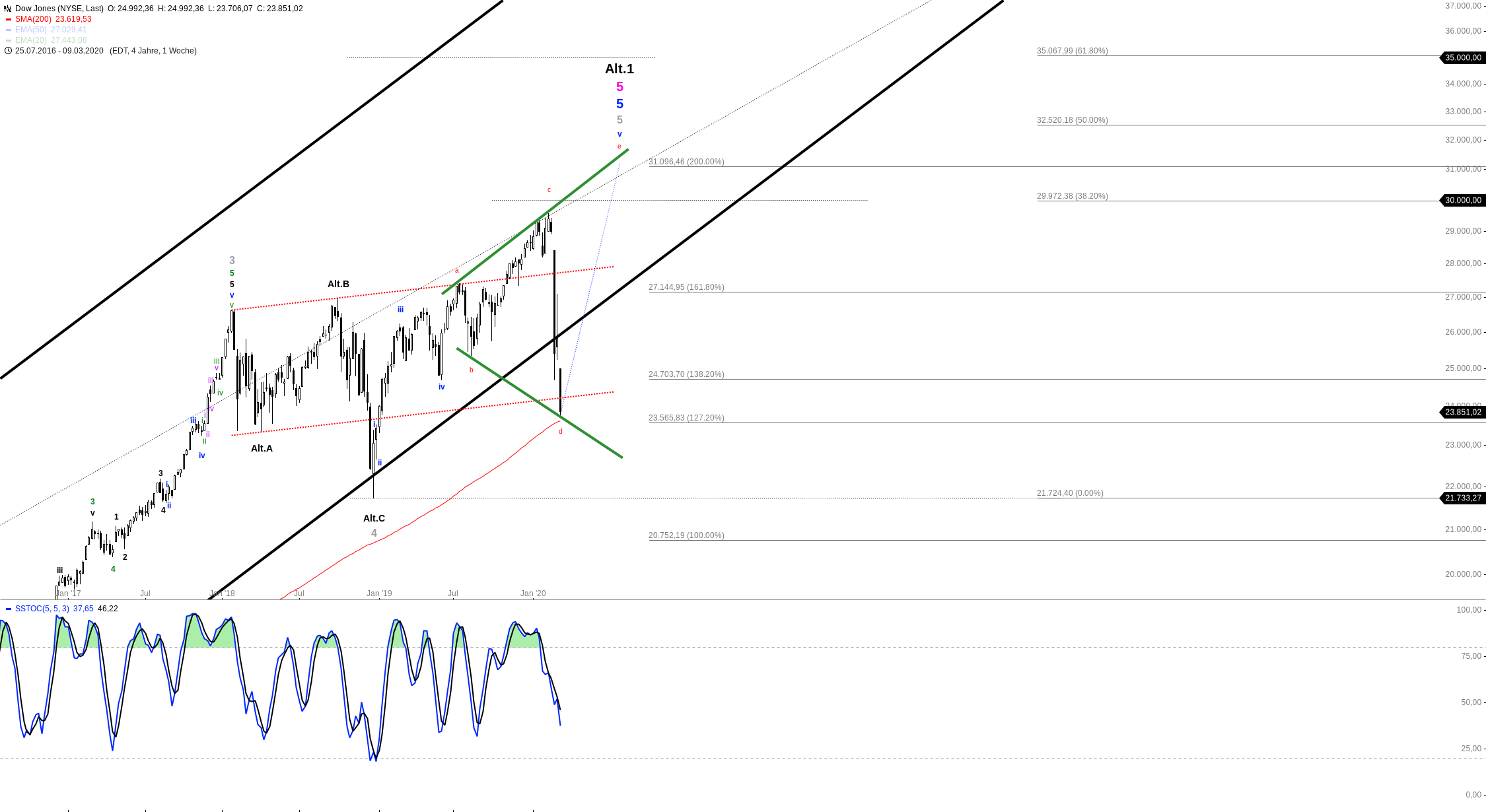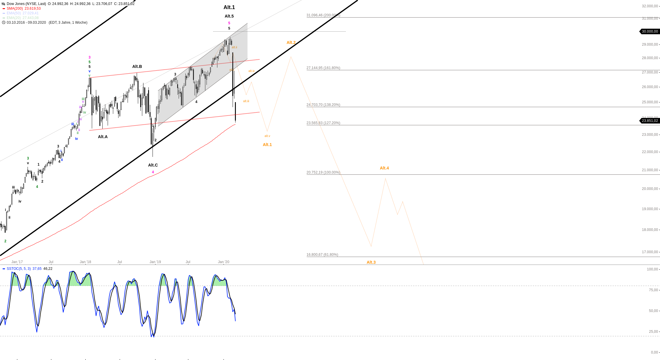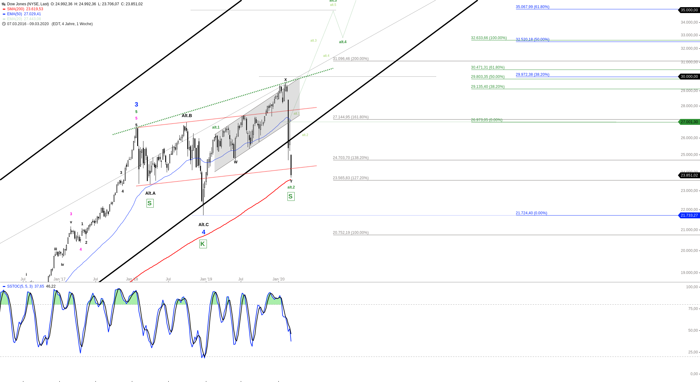 Schauen wir uns die Wochenchart-Szenarien aus unserem Monatlichen-Update Dow Jones, in ihrer Eintretungs-Reihenfolge, etwas genauer an.