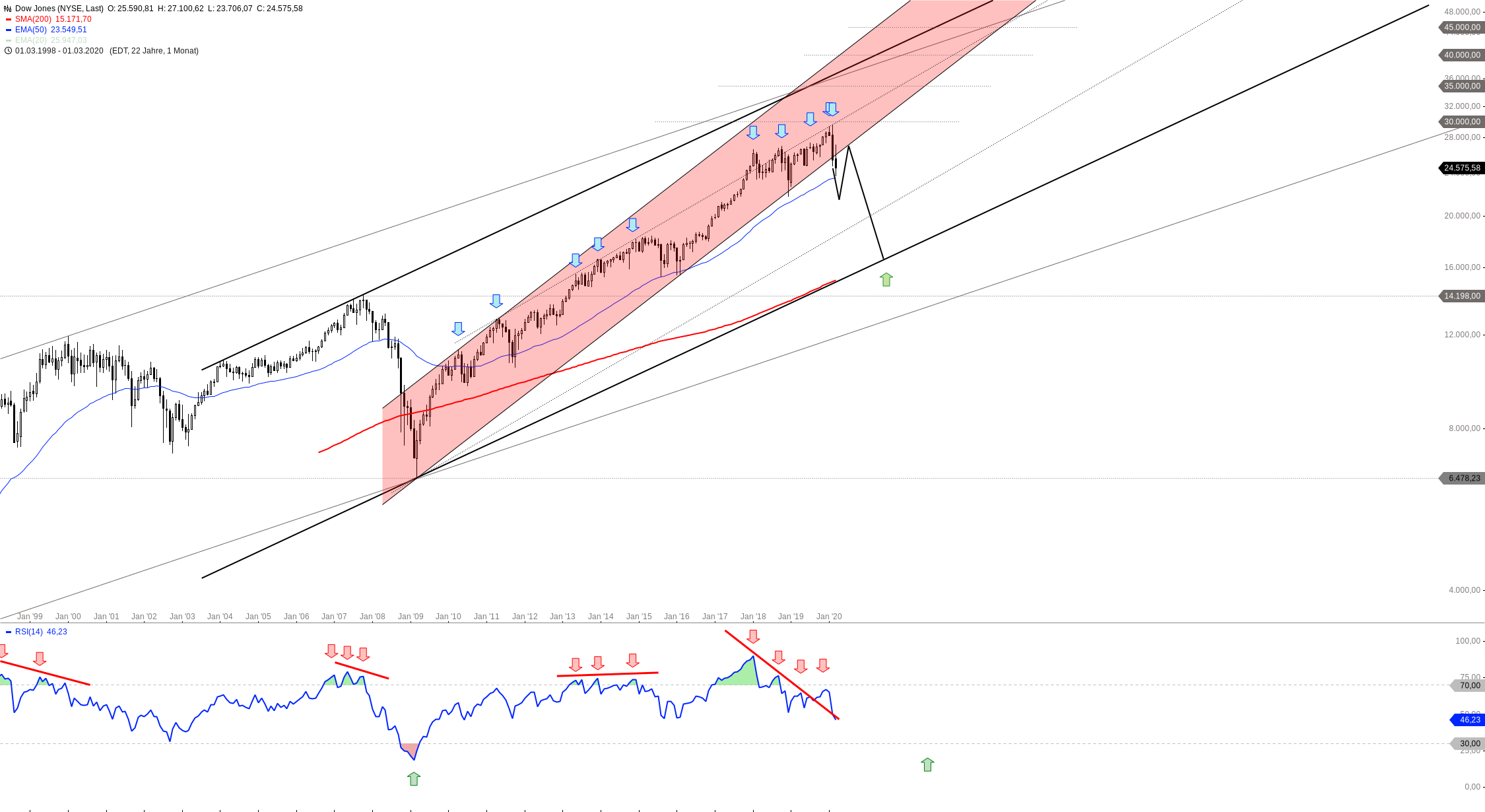 Wochenchart Dow Jones Index 1998 – 2020, eine Kerze entspricht einem Monat – Charts by Guidant.