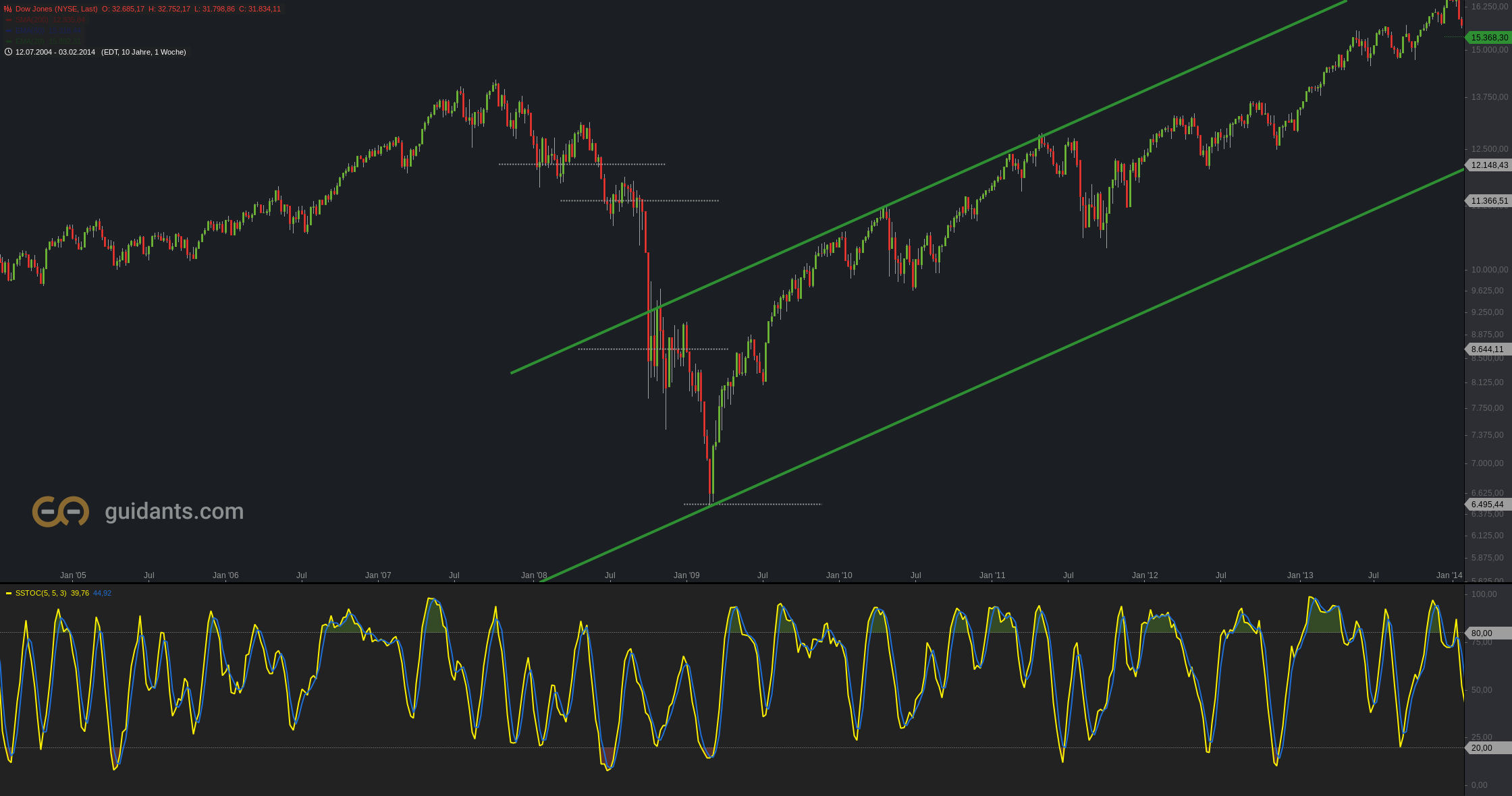 Wochencharts Dow Jones Index 2004 – 2013, eine Kerze entspricht einer Woche – Charts by Guidants.